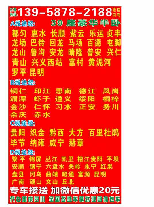 途径都匀,惠水,长顺,紫云,乐运,白层,贞丰,安龙,龙场,巴铃,鲁沟,屯脚,回龙,马场,兴仁,兴义,普安,册亨,望谟,威舍,富村,黄泥河,罗平,昆明,云贵川全省,专车免费接送,加微信优惠20元,微信同号,地址,白象老车站旁边,黄兴路24号